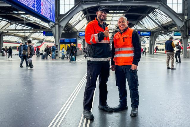 Die Reinigungsfachleute Fathallah Aniba (l.) und Moncef Saadouni (r.) halten den HB Zürich sauber.