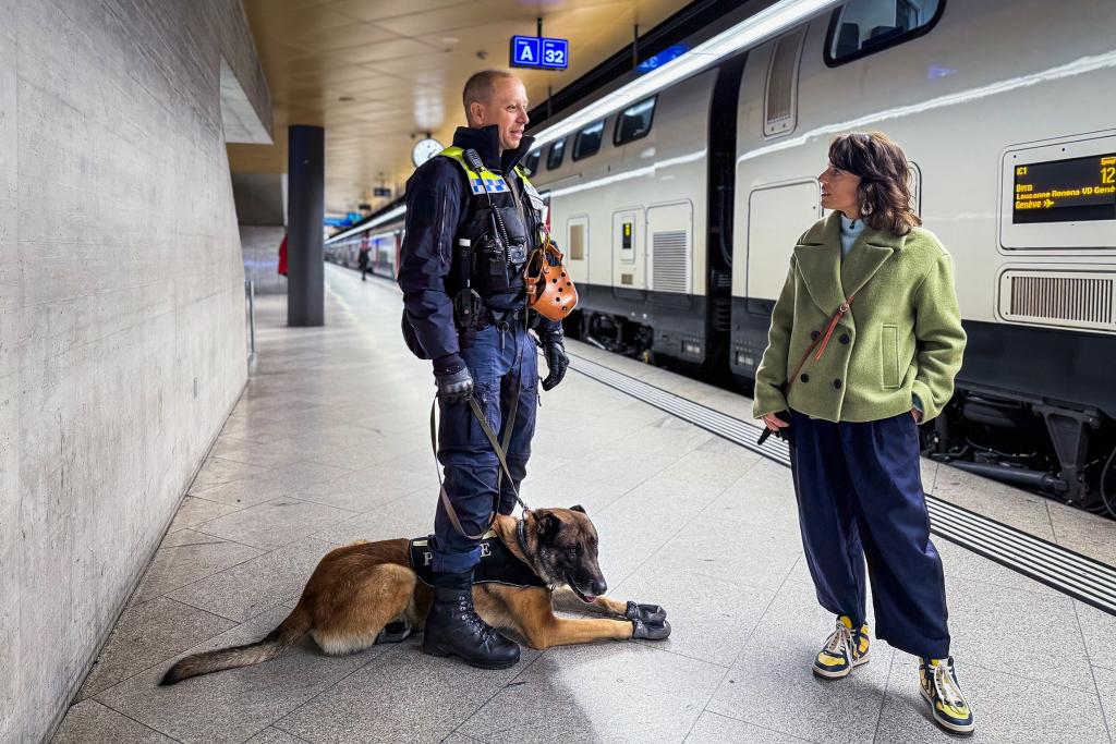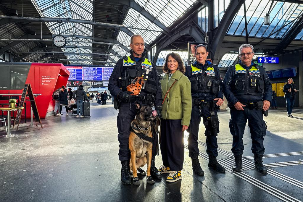 Transportpolizist Robin Brot (l.) und sein Hund Belzebub patrouillieren mit Mona Vetsch (r.) am HB Zürich.