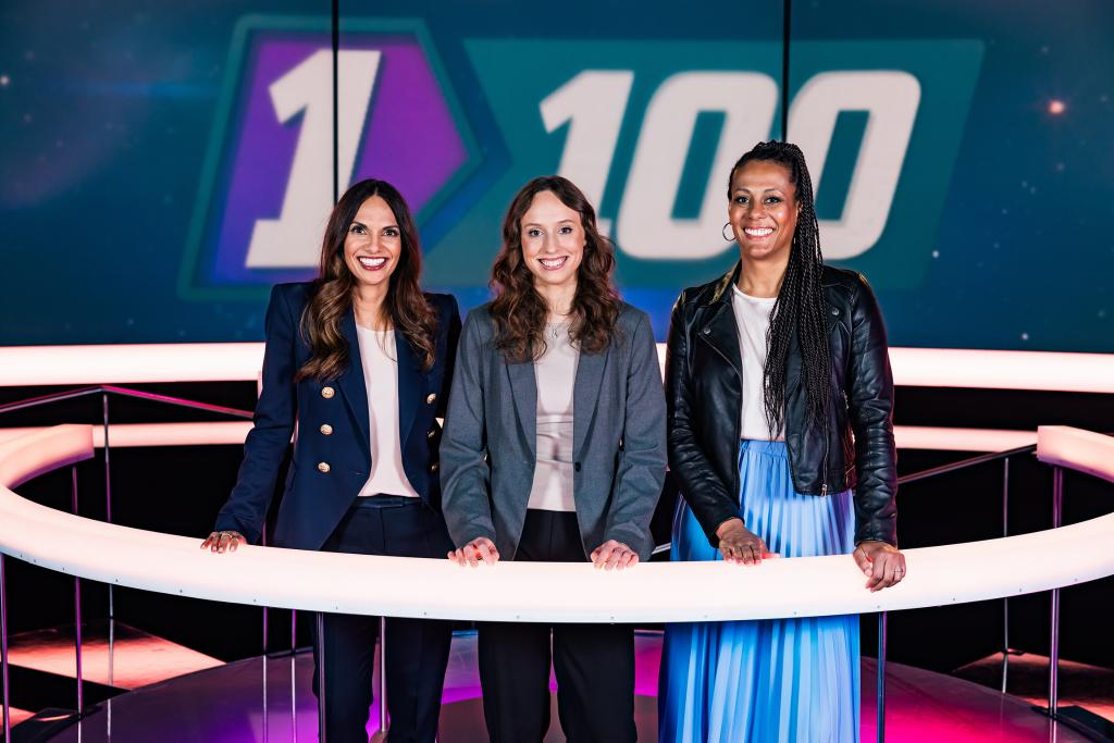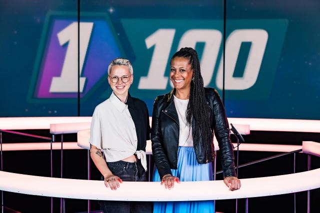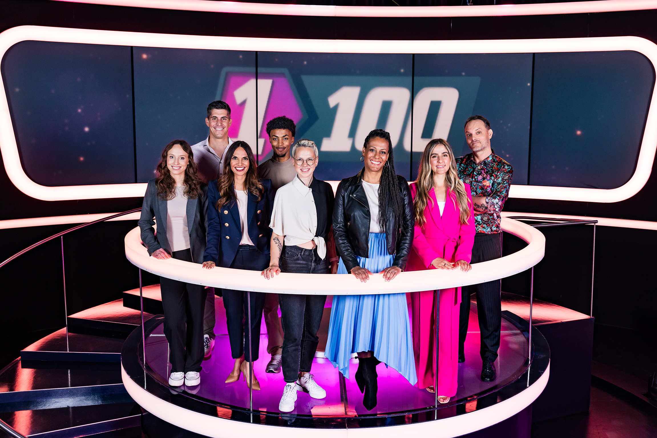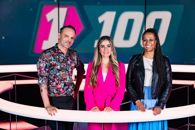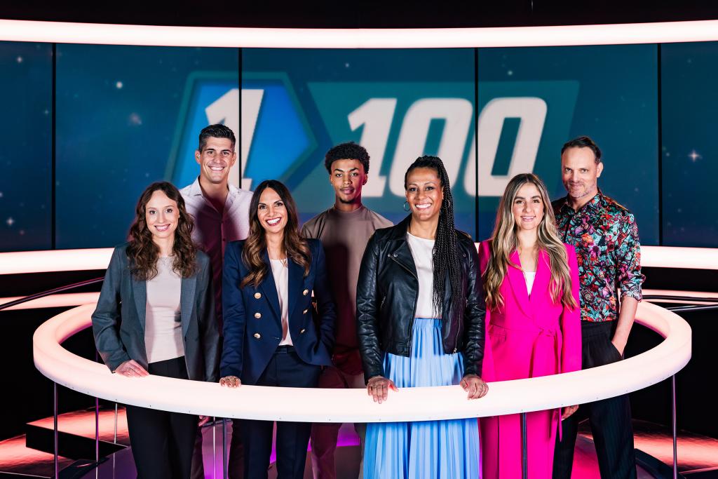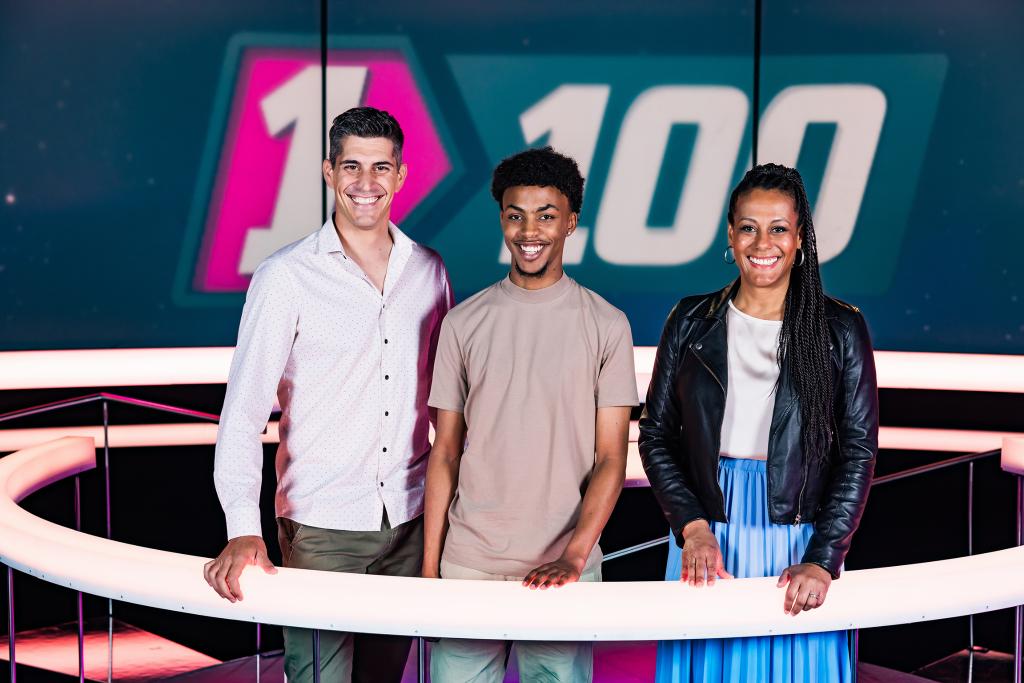Beim «1 gegen 100 – Berufs-Special» stehen Anna Maier, Franco Marvulli und Dominic Deville zusammen mit Personen, die aktuell in derselben Ausbildung sind, wie sie es selbst einmal waren, auf der Rateinsel bei Angélique Beldner.