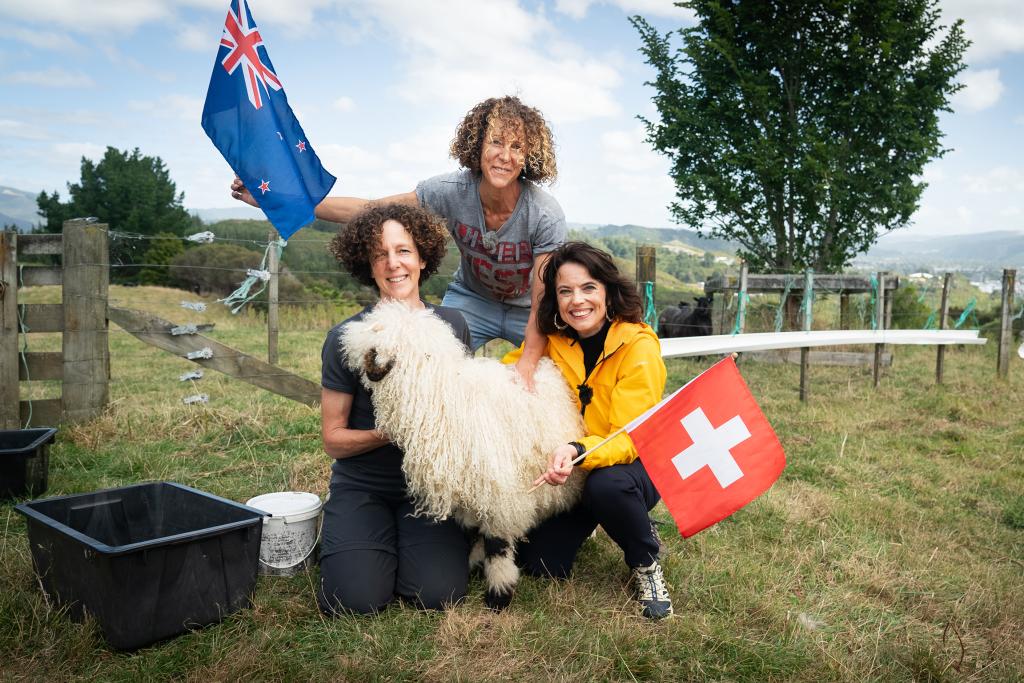 Die beiden Zwillingsschwestern Susan und Sabin Imhasly aus Sitten VS wollten nicht ohneeinander leben. Also wanderten sie beide mit ihren Familien nach Neuseeland aus. Heute produzieren sie Filz aus der Wolle ihrer eigenen Schafe. Als Mona Vetsch zu Besuch ist, werden die Tiere gerade geschoren – und zwar vom Weltmeister im Schafscheren.