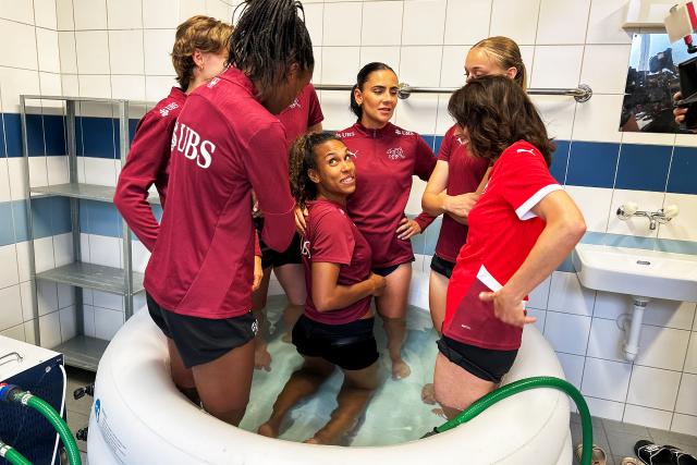 Mona Vetsch (r.) hüpft mit den Spielerinnen nach dem Training ins Eisbad.