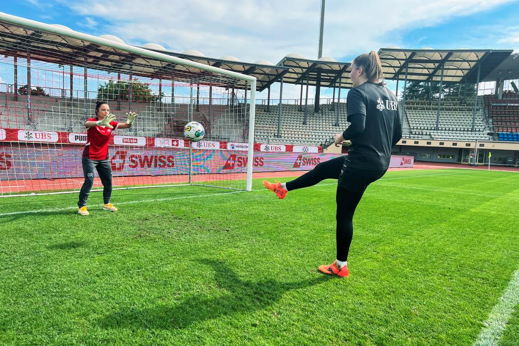 Torhüterin Nadine Böhi (r.) macht mit Mona ein Goalie-Training.