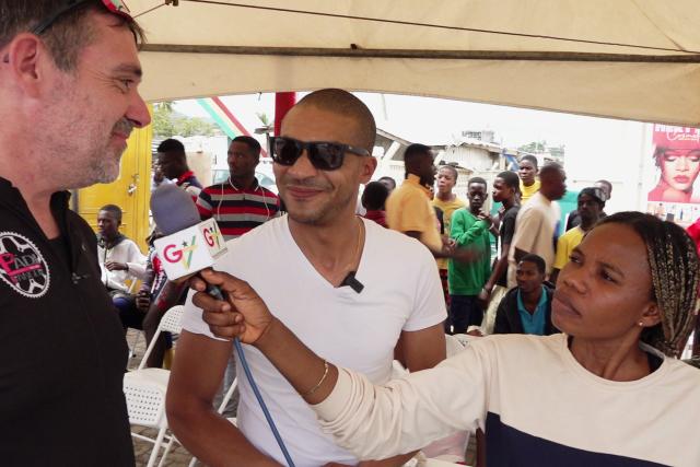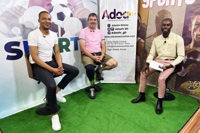 Carlos Mäder übersetzt für Pädi Ifanger beim Interview im ghanaischen Sportsender AdoaTV.