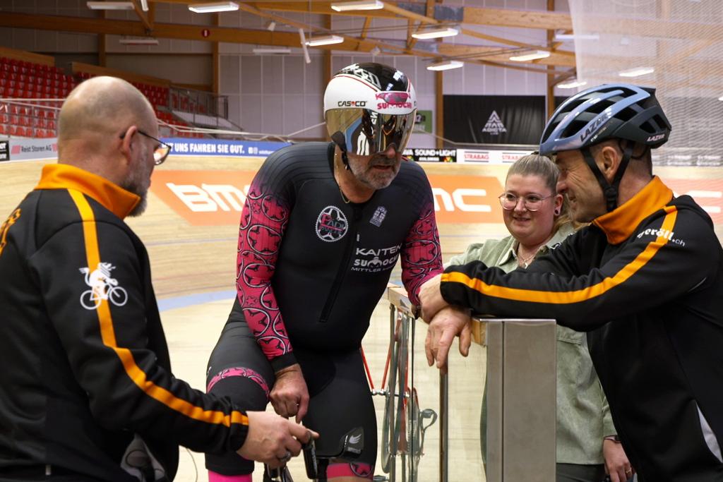 Mechaniker Yves Jäggi und Pädi Ifanger beim Training im Velodrom von Grenchen.