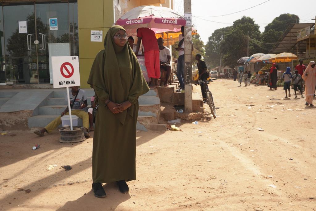 Fatoumatta Sandeng an der Westfield Kreuzung in Serekunda, wo ihr Vater während der Diktatur verhaftet und später ermordet worden war, Gambia, im Dezember 2023