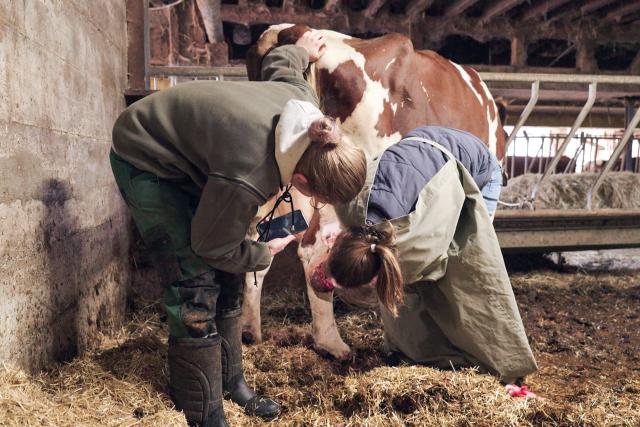 Landwirtin Sophie Bührer schaut sich gemeinsam mit der Tierärztin die Wunde von Kuh Hella an.
