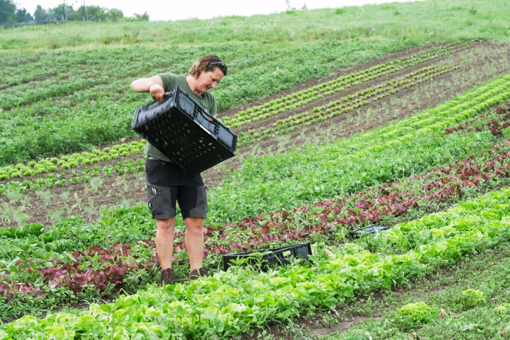 Landwirtin Sarah Dähler bei der Salaternte. Die Salatköpfe sehen perfekt aus, doch wegen des starken Regens sind viele innen drin verfault.