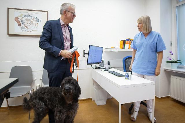 Botschafter Paul Seger lässt seinen Hund Kari vor seinem geplanten Fussmarsch von Deutschland nach Basel nochmals gründlich von der Tierärztin durchchecken.