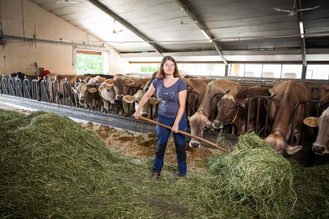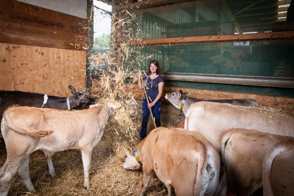 Nach einer kaufmännischen Ausbildung, der Ausbildung zur Landwirtin sowie der Bäuerinnenschule zog Simona 2017 auf den Eichenhof, drei Jahre später kam Tochter Ladina auf die Welt, 2023 Sohn Arno. Stefan Rüttner übernahm den Betrieb von seinen Eltern und übergab seiner Frau die Verantwortung über die Milchkühe und Kälber. So steht Simona jeden Tag zweimal im Stall und schaut zu ihren Tieren. «Am Morgen geniesse ich es, allein zu sein, niemand stellt Fragen und ich kann in Ruhe erwachen, und die Tiere beobachten, sie füttern, misten und schauen, dass jede Kuh in den Melkroboter geht und Milch gibt.»