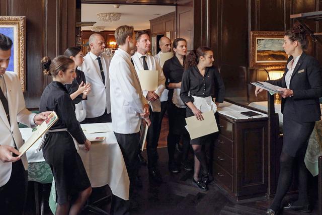 Täglich versammelt Restaurationsleiterin Julia Scussel kurz vor Türöffnung ihr Team und bespricht Gästeliste, Tischordnung und Tagesspezialitäten.