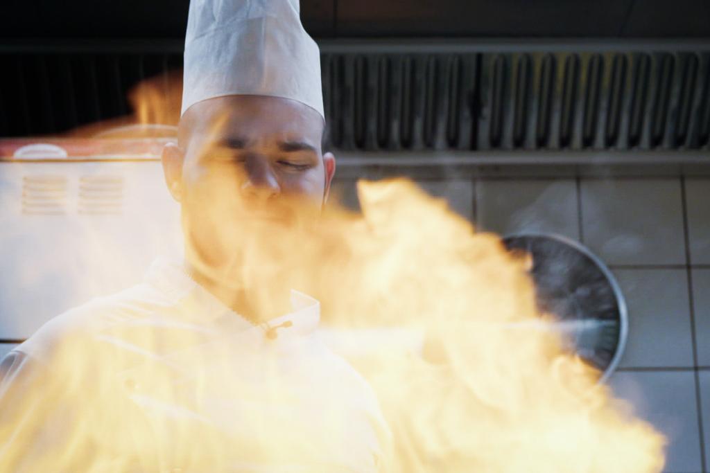 Beeindruckendes Spiel mit dem Feuer: Koch Kevin Jost flambiert in der Küche der Kronenhalle.