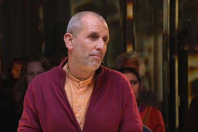 Hindu-Mönch Krishna Chandra und Moderatorin Olivia Röllin