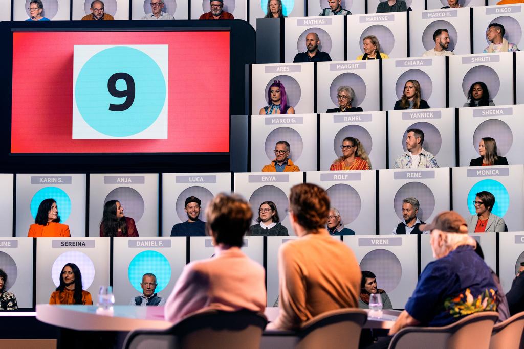 Neben den 100 Menschen sind drei prominente Zweierteams mit im Studio. Im Team «Politik» spielen Micheline Calmy-Rey und Andri Silberschmidt. Das Team «Happy Day» besteht aus Röbi Koller und Kiki Mäder. Und das Team «Comedy» vertreten Peach Weber und Reena Krishnaraja. Auch sie geben Einblick in ihren Alltag und haben die Aufgabe, bestmöglich einzuschätzen, wie die 100 Menschen auf die Fragen antworten. Das Gewinnerteam erhält 10’000 Franken, die für einen guten Zweck gespendet werden.