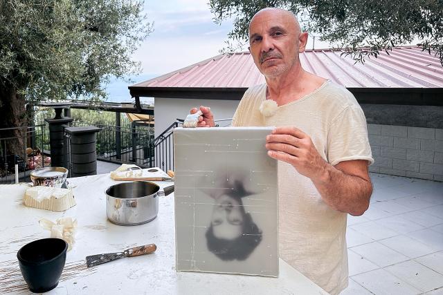 Patrick Lo Giudice arbeitet an einem Bild in seinem Freiluftatelier.