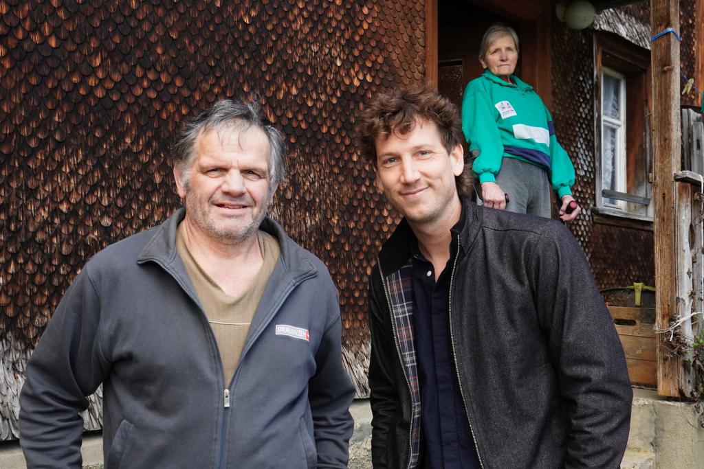 Donat Hofer (r.) mit einem Landwirt: Er kümmert sich um seine Eltern und den Hof.