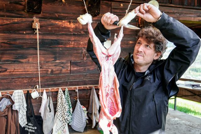 Donat Hofer häutet einen Hasen in der Naturschule Woniya.