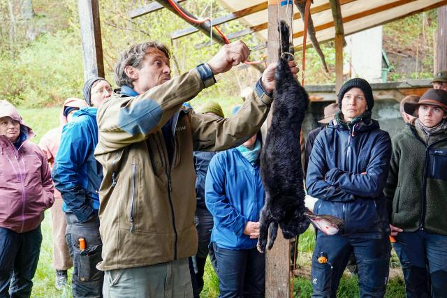 Naturpädagoge Simon Hasler demonstriert, wie man einen Hasen häutet.
