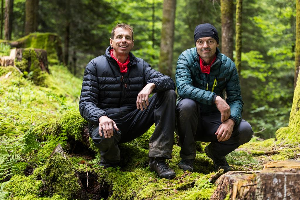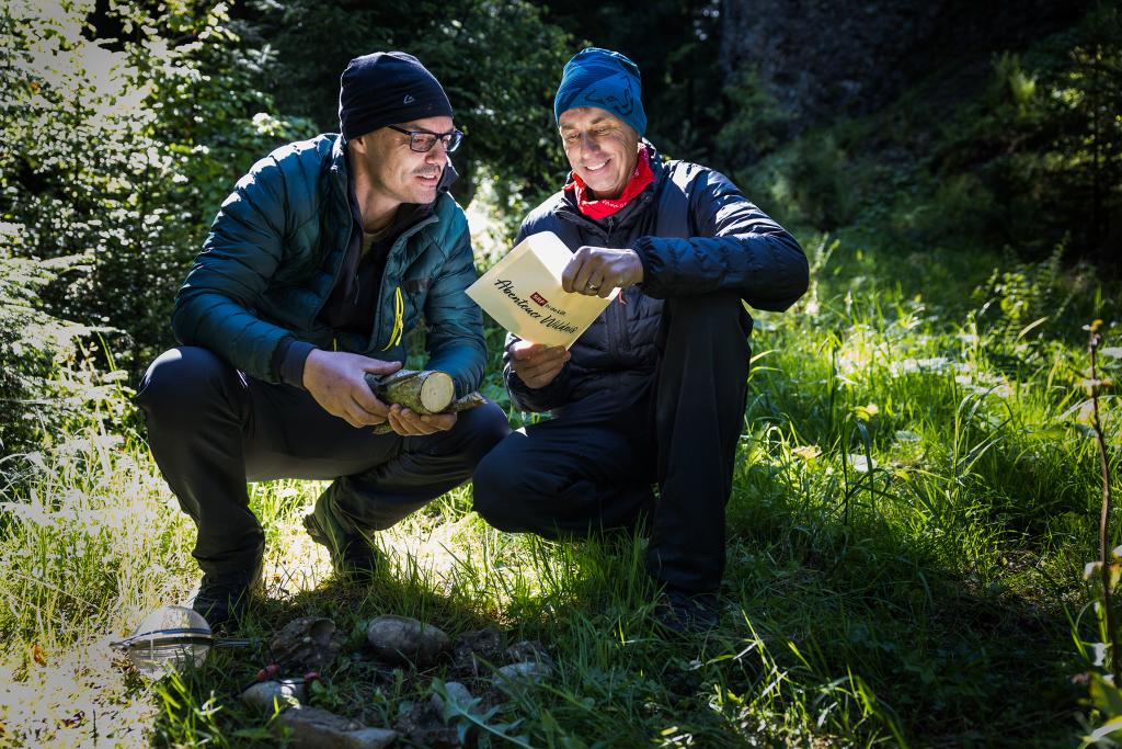 Die beiden Walliser Armin (links) und Marco (rechts) freuen sich über ihren Preis, den sie gerade in einer Challenge gewonnen haben. Das Problem: sie haben bis jetzt in ihrem Camp noch kein Feuer hingekriegt.