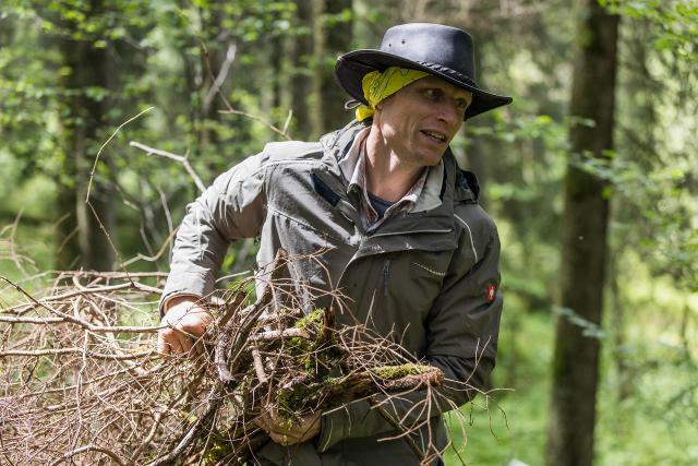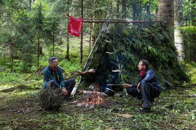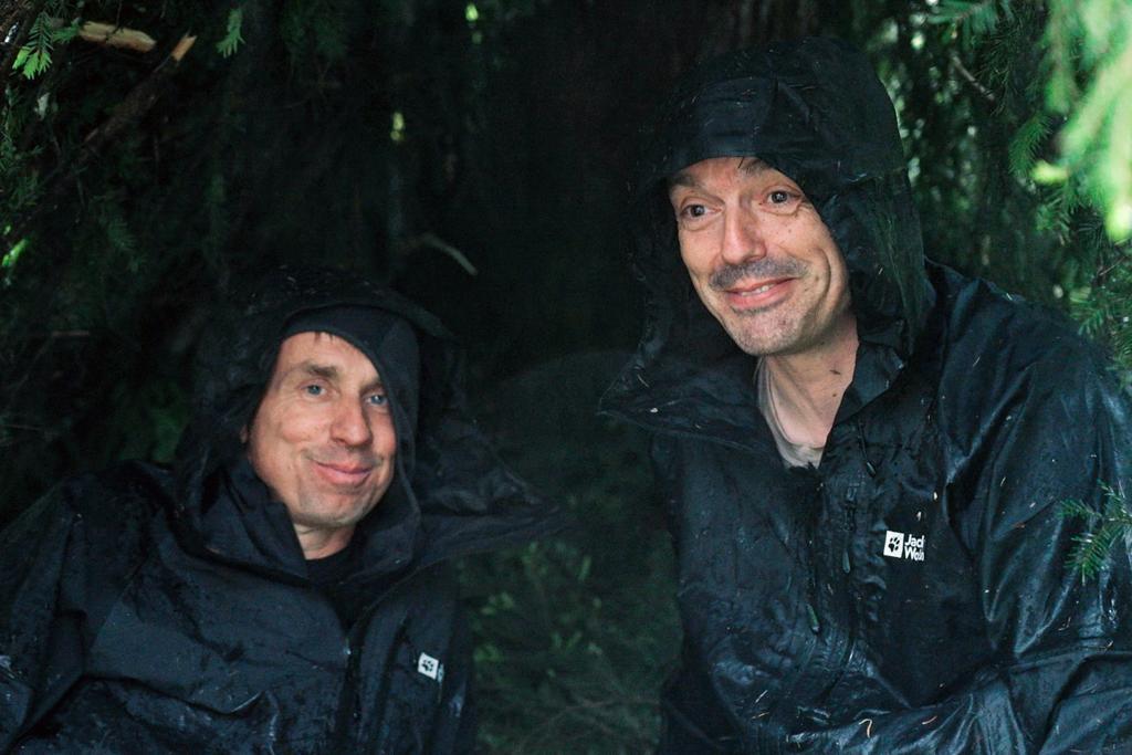 Marco und Armin versuchen sich vor dem Regen zu schützen. Die gute Laune vergeht ihnen aber bald. Langsam wird es kalt und bis jetzt haben sie noch kein Feuer hingekriegt.