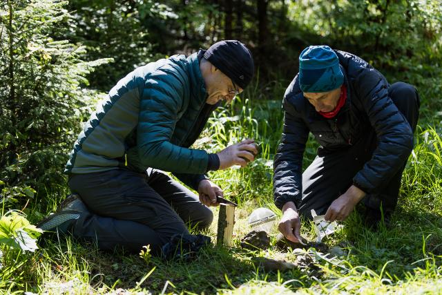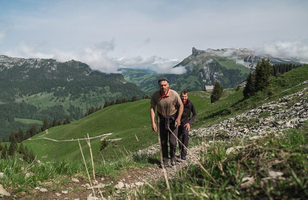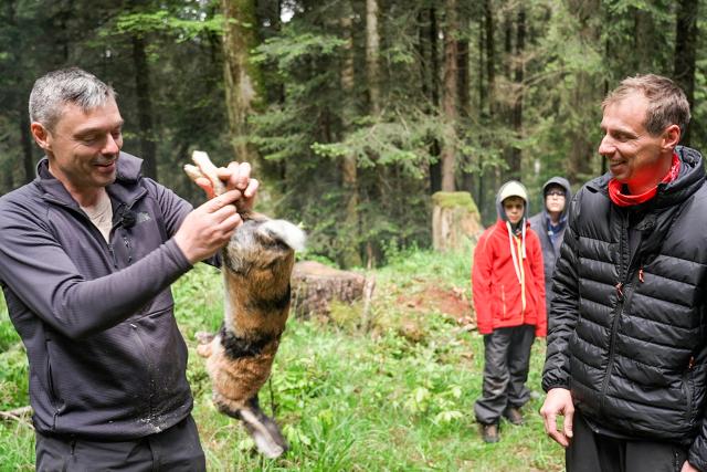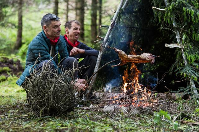 Die Walliser Armin und Marco braten den Hasen, den sie in der Challenge gewonnen haben.