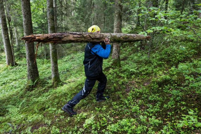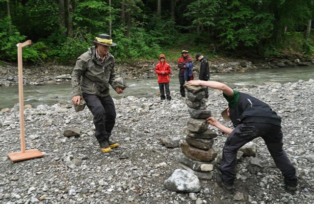 Wer schafft es am schnellsten einen 1.50 Meter hohen Steinturm zu bauen. Familie Liechti gibt alles.
