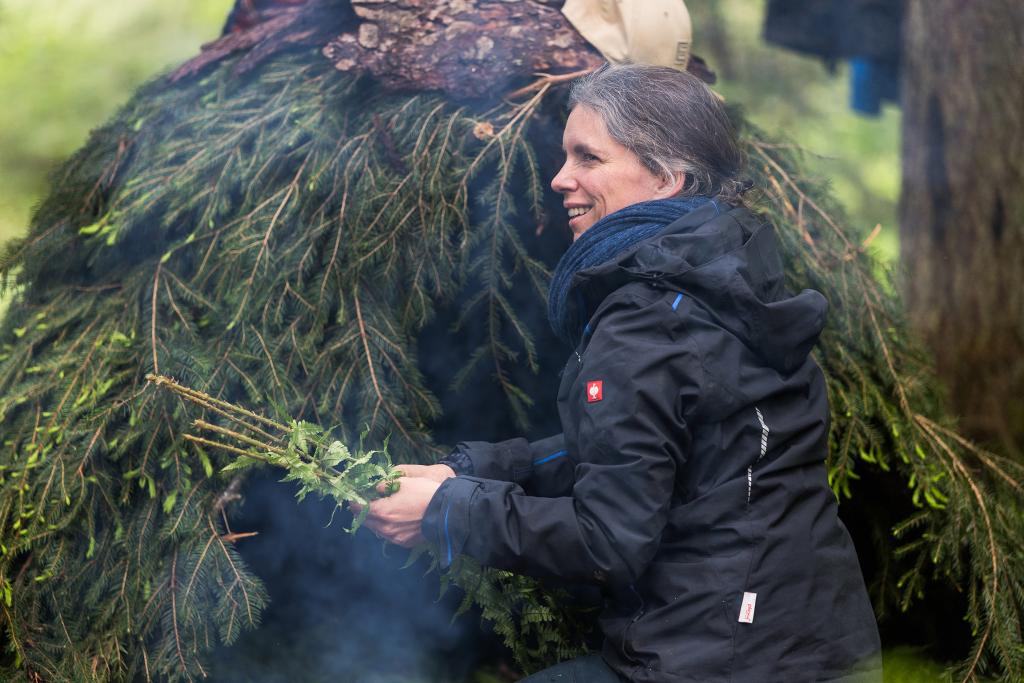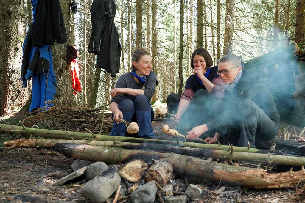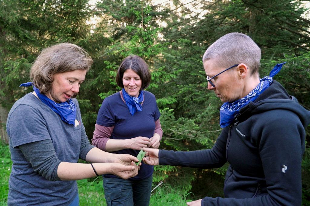 Die Frauen wissen sich zu helfen! Beatrice (Mitte) und Andrea (rechts) behandeln Giselas allergischen Ausschlag an den Armen mit Spitzwegerich.