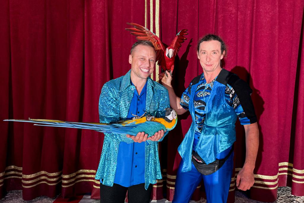 Papageien-Nummer: Jan Fitze und der Besitzer der Papageien, Benjamin Pfeiffer