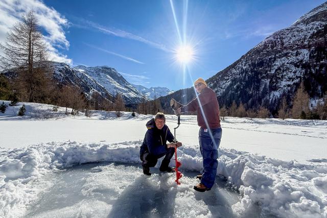 Jan Fitze auf dem Camping Morteratsch im Engadin (GR): Zusammen mit Camping-Chef Peer Käch bohrt Jan Fitze ein Eisloch
