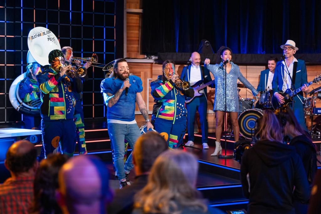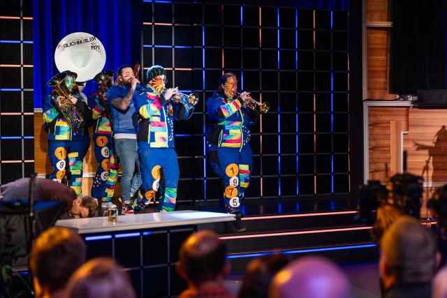 Baschi und die Guggenmusik Füdlichnübler aus Wangen ZH geben eine wilde Version von «Bring en hei» zum Besten