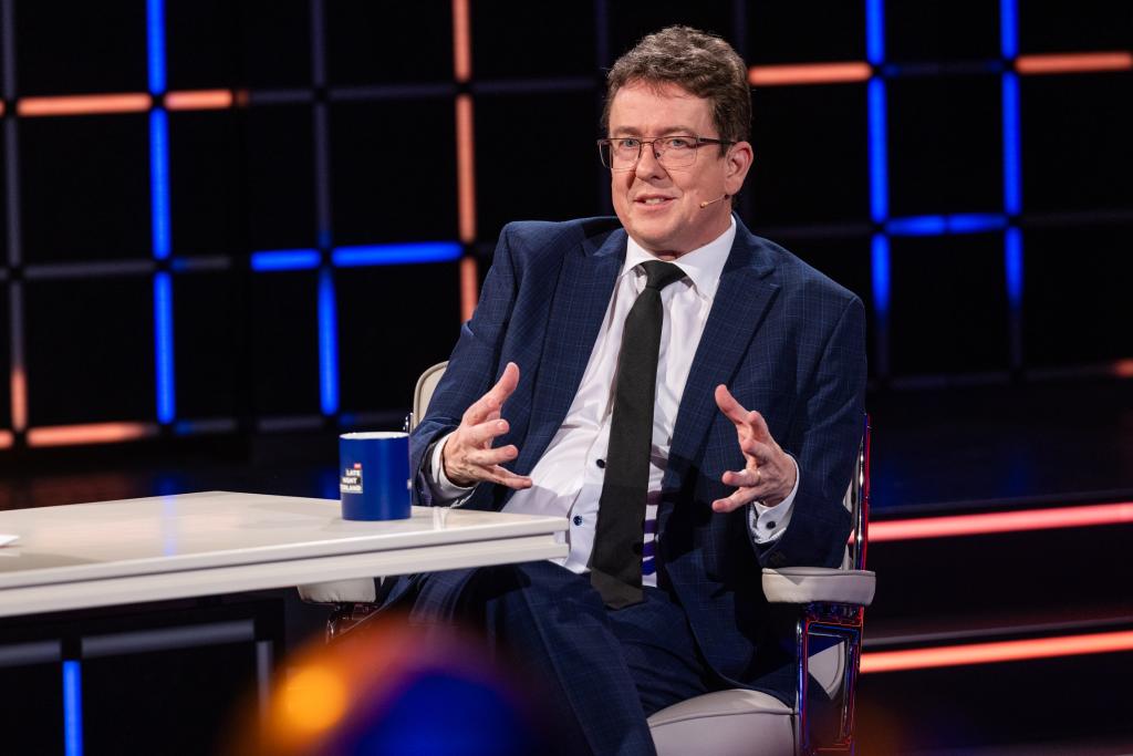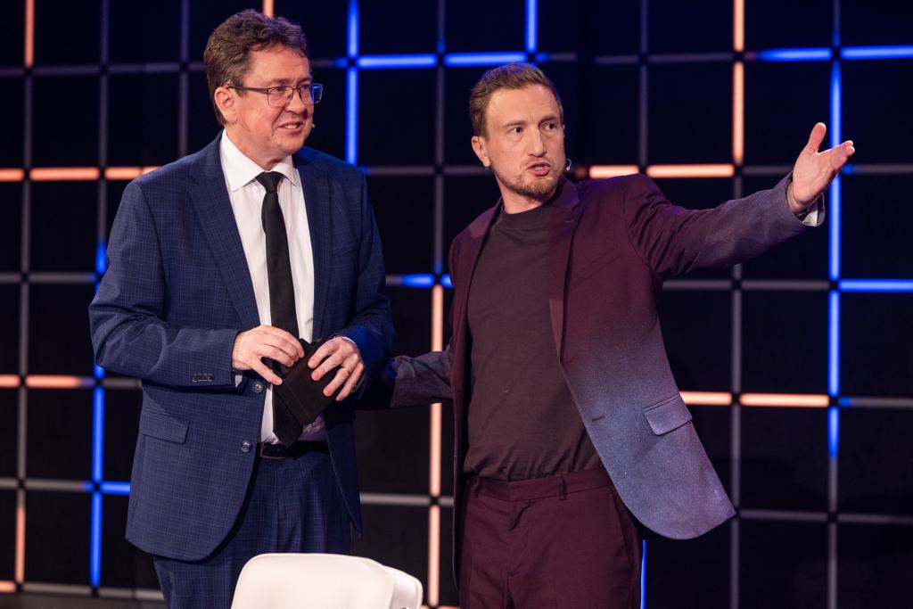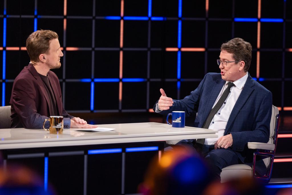 Host Stefan Büsser mit seinem ersten Talkgast, Bundesrat Albert Rösti