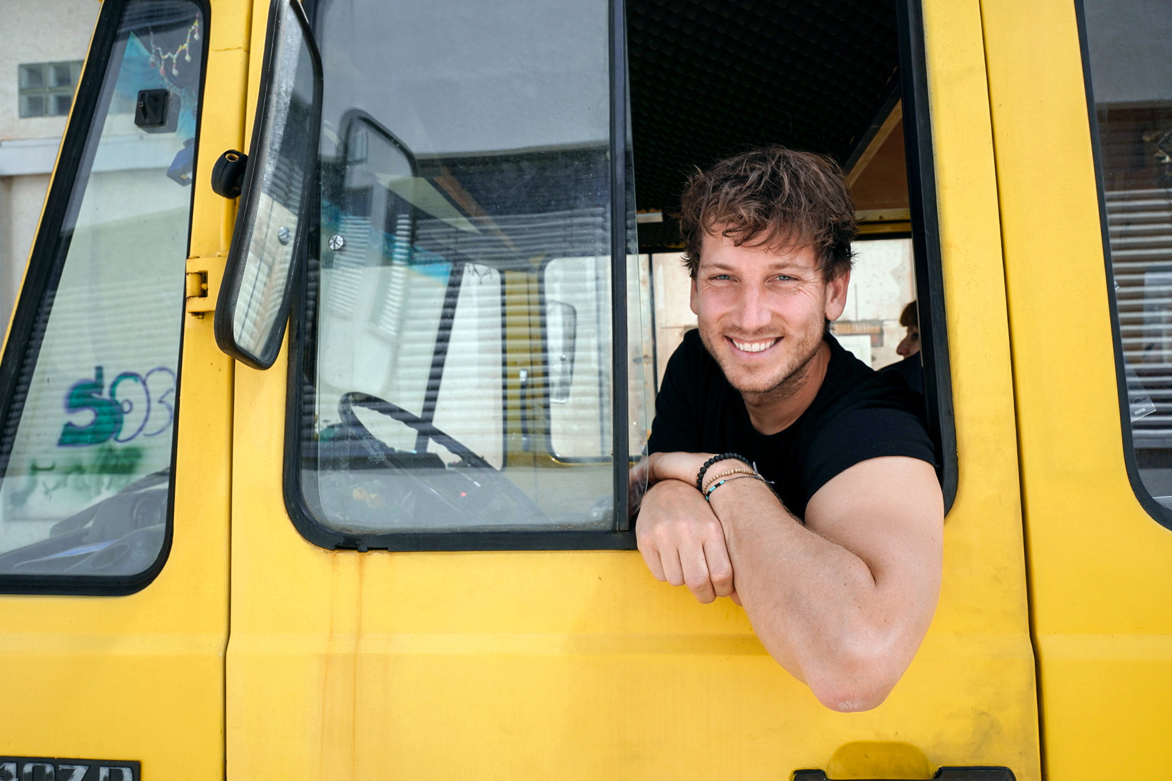 Reporter Donat Hofer am Steuer seines gelben Busses