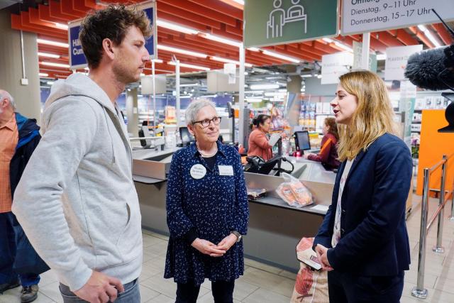 Ein Projekt gegen Einsamkeit: Die Plauderkasse Migros Gundelitor in Basel. V.l.n.r.: Reporter Donat Hofer mit der Freilwilligen Maya Jakob und Initiantin Stefanie Näf-Seiler
