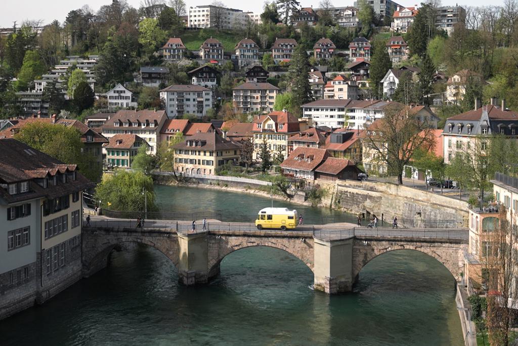Reporter Donat Hofer und sein Kamerateam sind mit ihrem gelben Bus in Bern unterwegs.