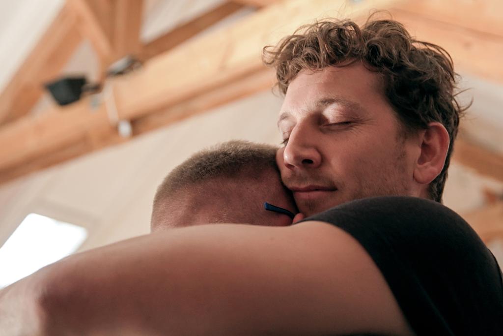 Reporter Donat Hofer (l.) nimmt an einem Kuschelseminar teil.