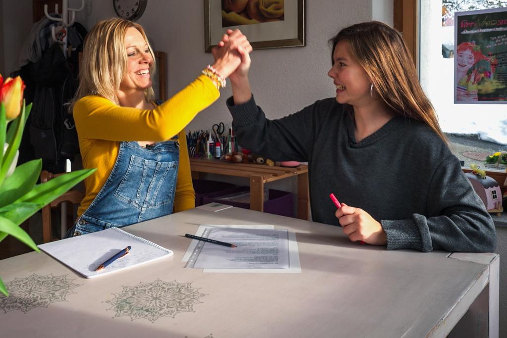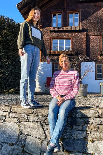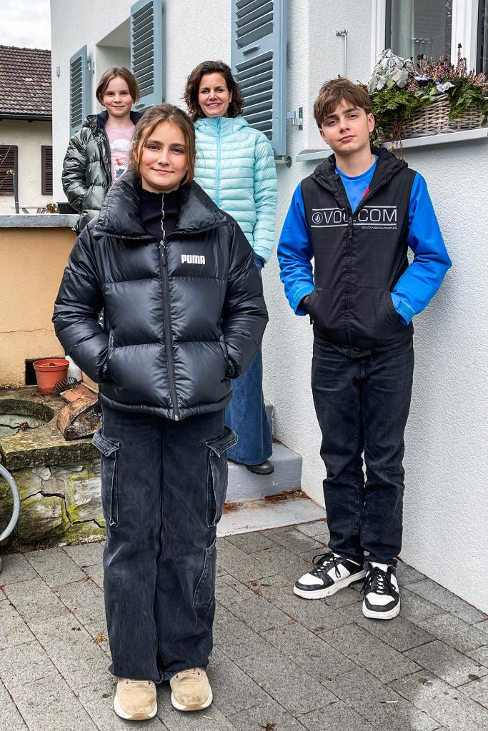 Sandra aus Interlaken BE, 46, mit ihren Töchtern Mia (vorne) und Olivia (l.) und Sohn Manu