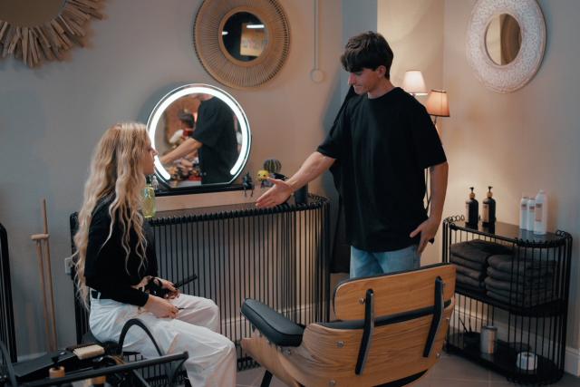 Regisseur Jyari Pasanen (l.)bei den Dreharbeiten im Coiffeursalon