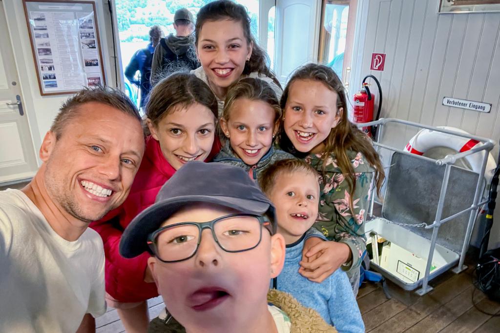 SRF-Redaktor Jan Fitze unterwegs auf dem Vierwaldstättersee mit den Kindern der Familien Achermann und Inderbitzin.