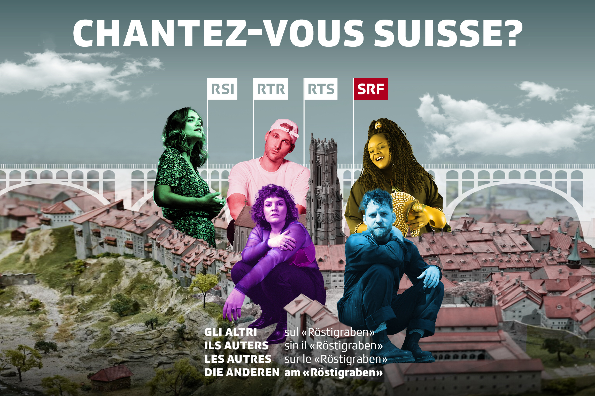 Die nationale Radiogruppe der SRG «Die Anderen – Les autres – Gli altri – Ils auters» bringt am Röstigraben fünf Schweizer Musikschaffende zusammen: Im Rahmen des Radioprojekts «Chantez-vous Suisse?» werden eine Woche lang Lieder aus allen vier Schweizer Sprachregionen neu interpretiert und gemeinsam ein neuer Song erfunden. Den Höhepunkt der Woche bildet ein gemeinsames Konzert für die Öffentlichkeit in der Freiburger Altstadt.